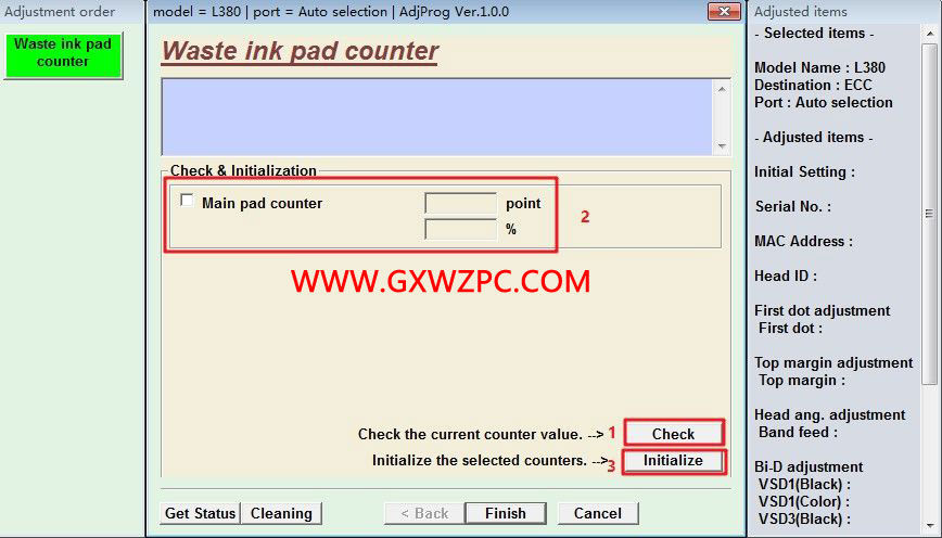 點(diǎn)擊Check按鈕,獲取當(dāng)前廢墨計數(shù)器的數(shù)值,然后選中計數(shù)器前面的選擇框,點(diǎn)擊Initialization按鈕完成初始化。